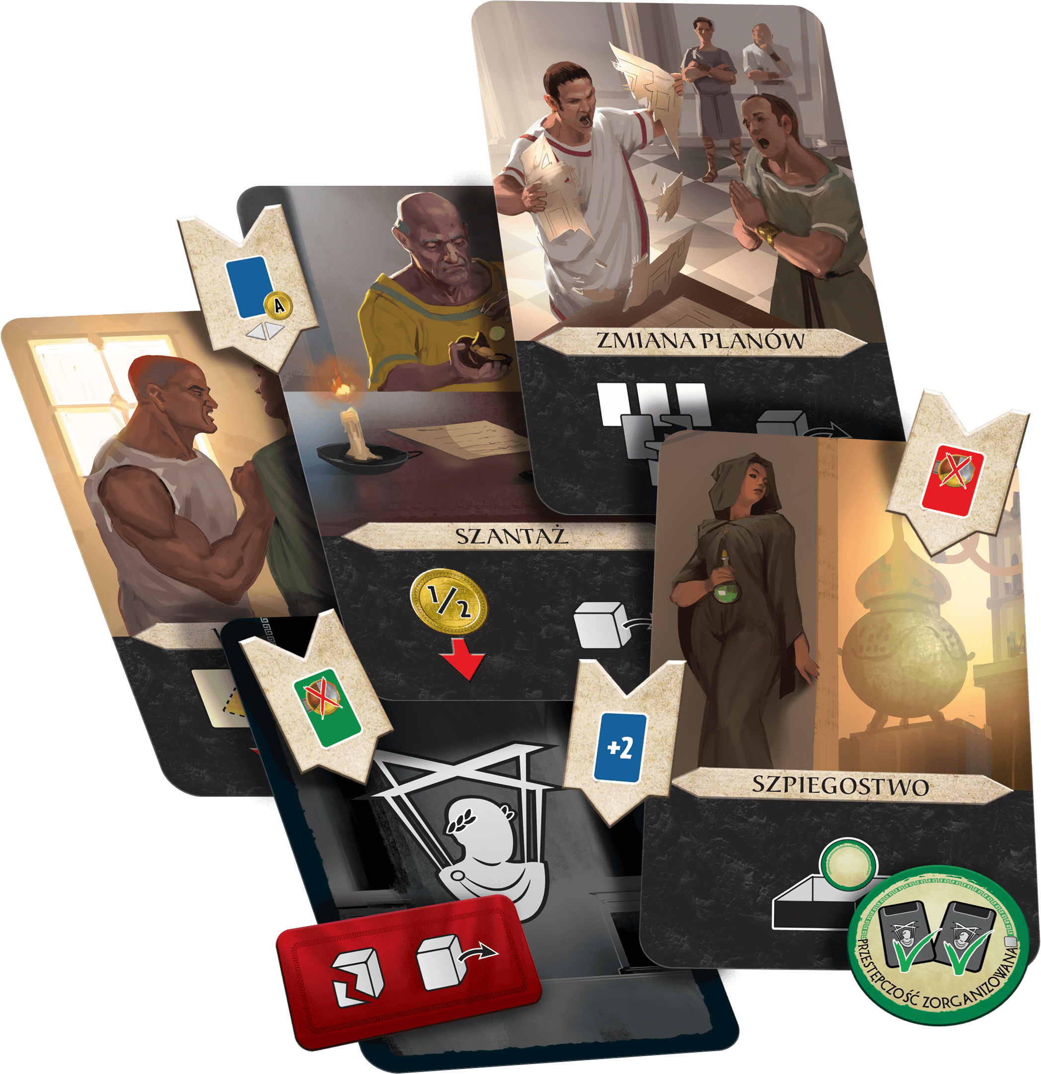 - Karty spisku reprezentujące tajne działania, które możemy przygotować i aktywować w karcie gry.