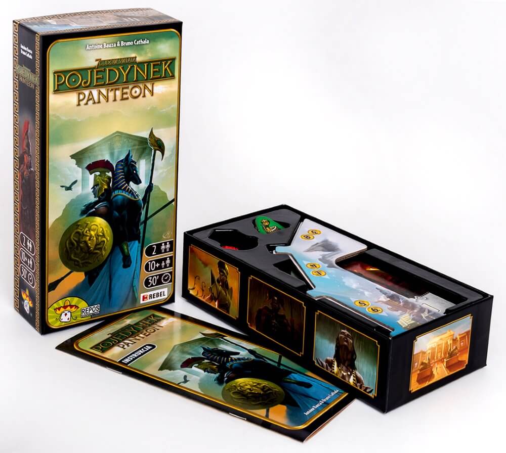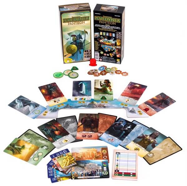 Dodatek Panteon wprowadza antycznych bogów do gry 7 Cudów Świata: Pojedynek. Teraz gracze mogą ubiegać się o przychylność bóstw z pięciu różnych kręgów kulturowych i skłonić je wszystkie do roztaczania swojej opieki nad ich miastem. Z pewnością pomoże w tym budowa bogatej świątyni ku czci wybranego patrona lub patronki albo poświęcenie im jednego z dwóch nowych Cudów Świata dostępnych w dodatku.