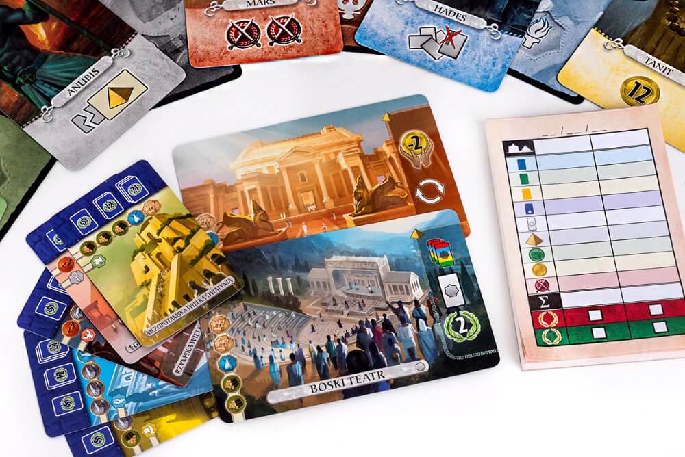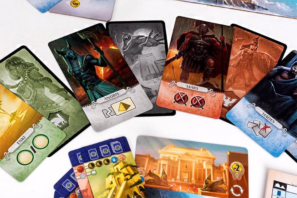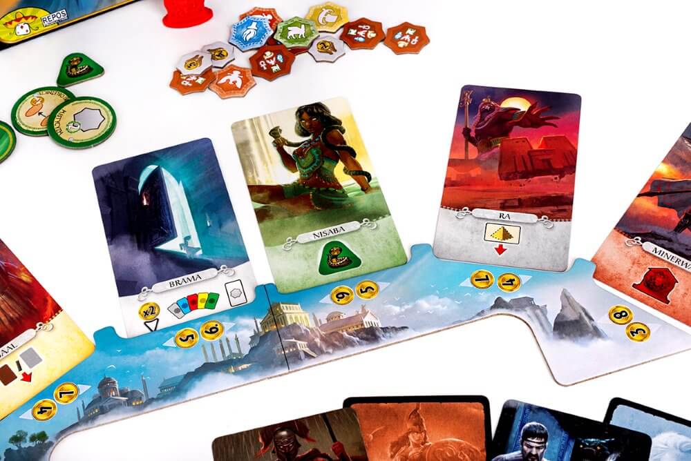 Podczas Ery I będziesz zbierać żetony Mitologii pozwalające wybrać, które bóstwo zamieszka w Panteonie, oraz żetony Darów, dzięki którym zaskarbisz sobie ich przychylność. Później, w Erze II i III możesz obudzić boga lub boginię w Panteonie zamiast dobierać kartę. Jeśli zapewnisz bóstwu to, czego od Ciebie żąda, możesz umieścić je obok swojego miasta.