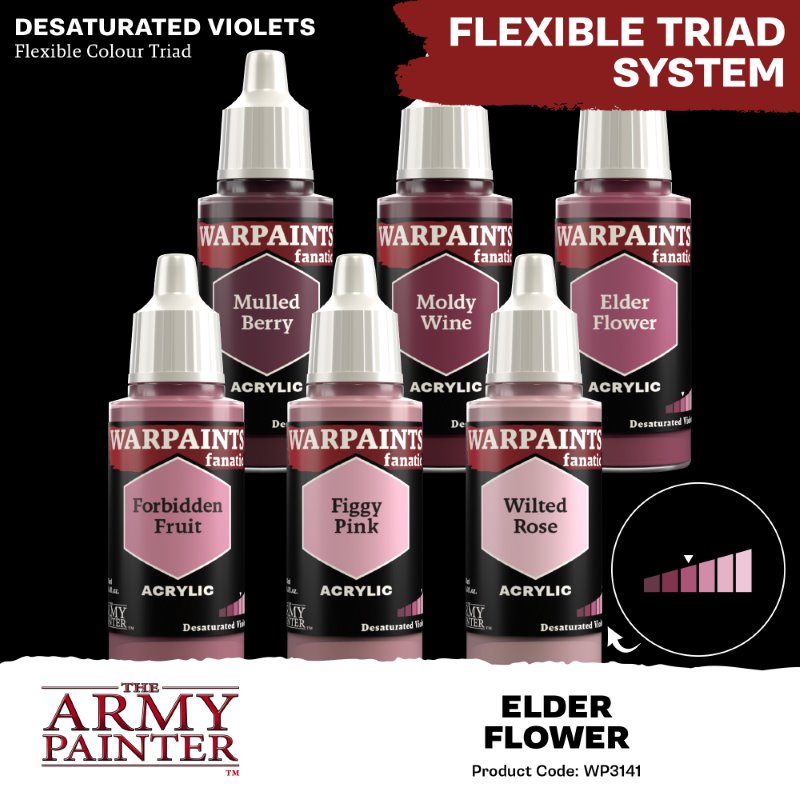Elder Flower to jasny, wyciszony różowo-liliowy kolor kwiatów czarnego bzu — pastelowa jasność bez jaskrawości typowych różów z T21. Odpowiednik Fulgrim Pink, choć w bardziej stonowanym, liliowym wariancie. Nakładasz go jako finalne rozświetlenie lub jako samodzielny kolor delikatnych kwiatów i tkanin.