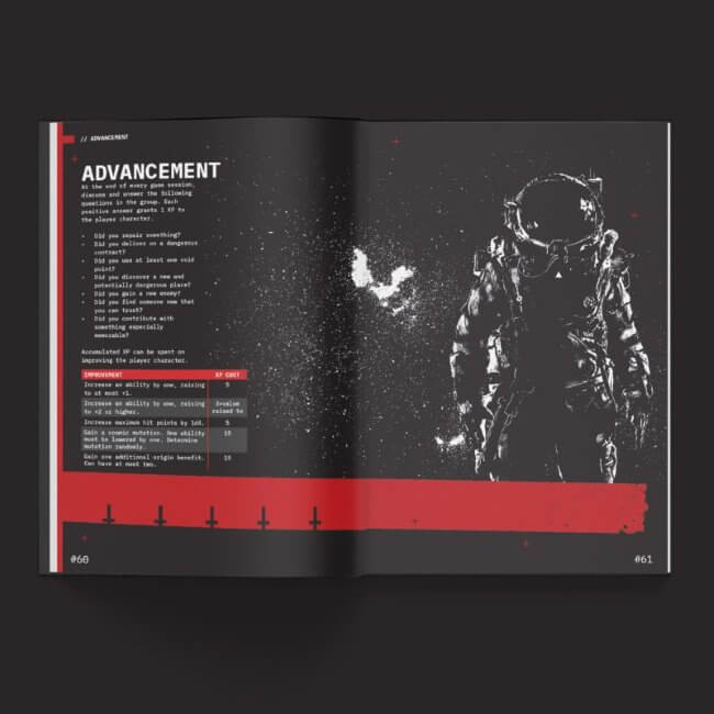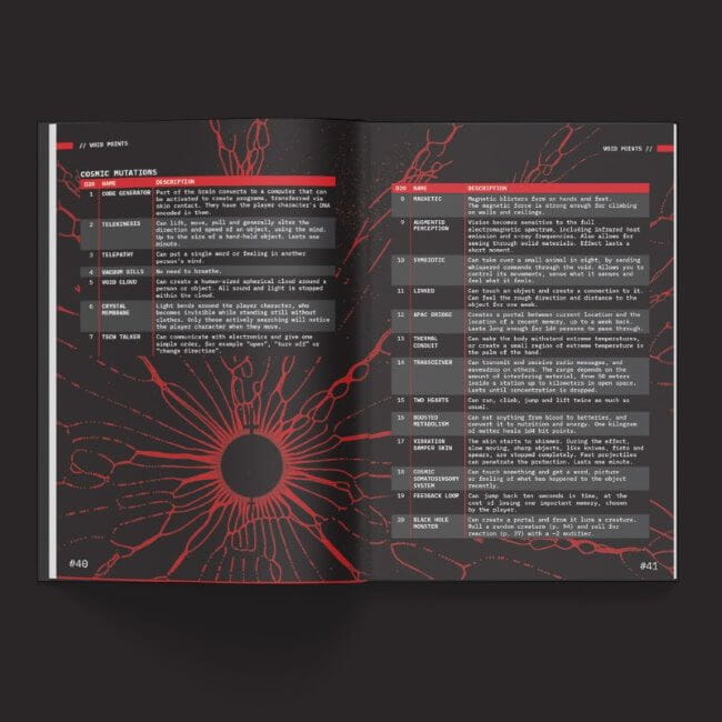 - Zasada Pustki (Void): Jeśli zawalisz test umiejętności (fail), zyskujesz potężne punkty Void Point ułatwiające rzuty w przyszłości, ale ryzykujesz kosmiczną mutacją od promieniowania (Cosmic Corruption).