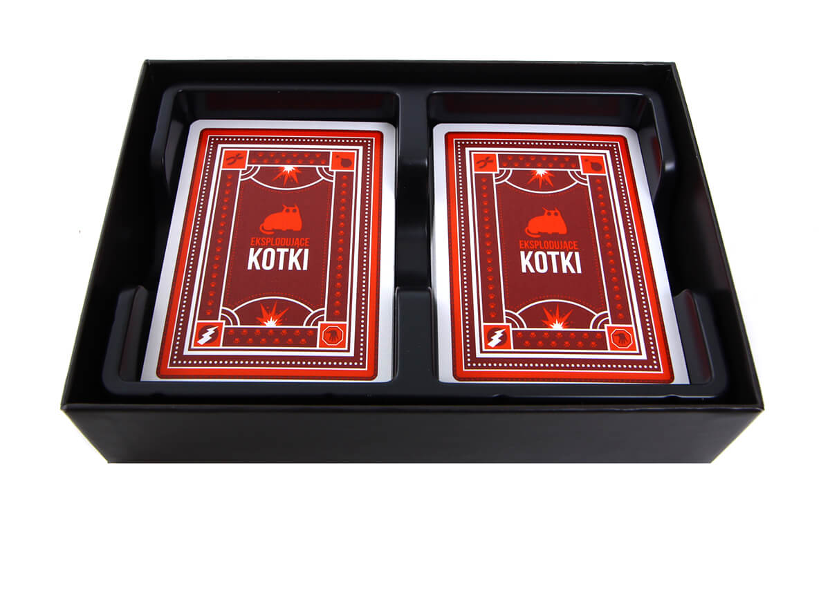 W talii znajduje się kilka eksplodujących kotków. Aby zagrać, połóżcie ją rewersami kart do góry i kolejno ciągnijcie karty do momentu, aż ktoś z Was dobierze eksplodującego kotka. Osoba, która na niego trafi – wybucha. I już do końca gry pozostaje martwa. Przy okazji możecie zagrywać różne karty odwracające uwagę eksplodujących kotków.