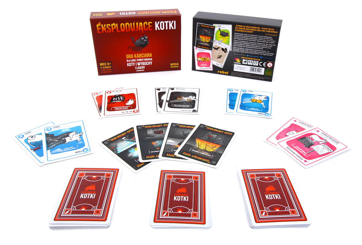 Eksplodujące Kotki to napędzana kociakami odmiana rosyjskiej ruletki. Gracze ciągną co turę po karcie, aż do momentu dobrania eksplodującego kota - wtedy nieszczęśnik wybucha i ginie, a gra się kończy. Ale! W talii są też karty, dzięki którym można odwrócić uwagę samobójczego kocięcia, uniknąć go, czy też zmusić przeciwnika do dobrania kilku kart na raz.