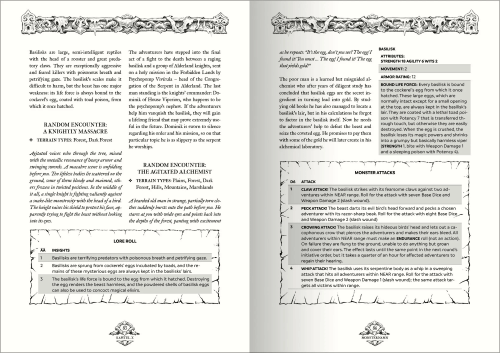 - Unikalne spotkania: Ponad 20 najdziwniejszych i najbardziej niebezpiecznych stworów powiązanych z fabularnym tłem Krain – każdego z nich opisano za pomocą unikalnych tabel ataku i zachowań (Random Encounters).