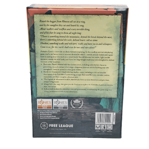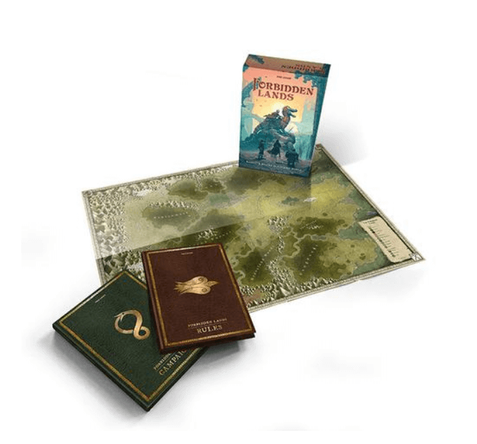 W pudełku Forbidden Lands: Core Boxed Set odnajdziesz dwa podręczniki w wydaniu ekskluzywnym (Player’s Manual, Gamemaster’s Guide) zawierające m.in. broszurę Legends & Adventurers pozwalającą rozwinąć swoje postacie i nadać im unikalne tło, kolorową mapę, a nawet arkusz z naklejkami na miejsca przygód oraz nagrobki.