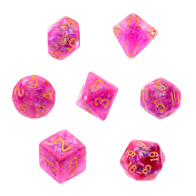 Komplet kości marki Rebel, czyli siedem niezwykle oryginalnych kości w stonowanych kolorach, wzbogaconych o mieniący się brokat, który przepięknie chwyta światło. Niezwykle wysoka jakość odlewu, precyzja żłobienia oraz malowania numerów, czynią z nich podstawowy wybór dla wielu graczy, zarówno początkujących, jak i zaawansowanych.