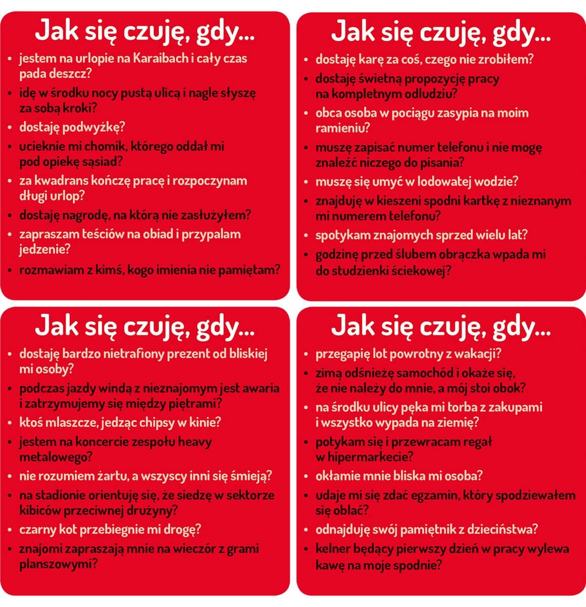 Zadajesz pytanie zaczynające się od JAK SIĘ CZUJĘ, GDY…, a pozostali gracze wykładają po jednej karcie – takiej, która według nich najlepiej pasuje do odpowiedzi na twoje pytanie. Wybierasz tę, którą uważasz za najlepiej oddającą twoje emocje. Gracz, który ją wyłożył, zdobywa punkt! Zwycięzcą zostaje osoba, która zdobędzie 3 punkty.