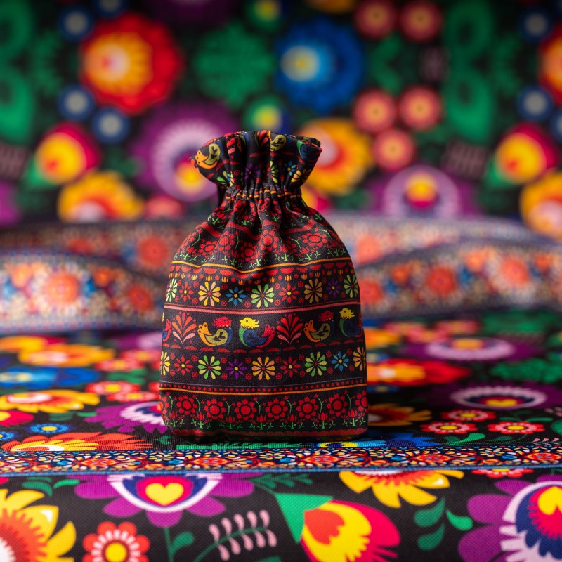 - Nadruk Full Art: Cały materiał (do samego sznurka!) został naszpikowany pięknym, pełnokolorowym motywem przedstawiającym kompozycję tradycyjnego, słowiańskiego haftu w ludowym klimacie. Grafika jest niezwykle trwała i odporna na ścieranie.