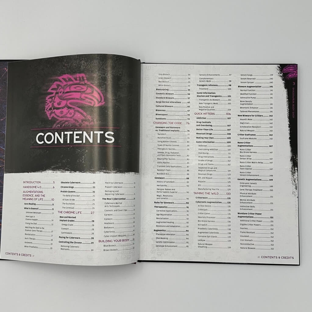 Książka drastycznie rozbudowuje podstawową listę ulepszeń (Cyberware i Bioware), dostarczając tonę nowego sprzętu operującego na rzutach pulą sześciościenną.
