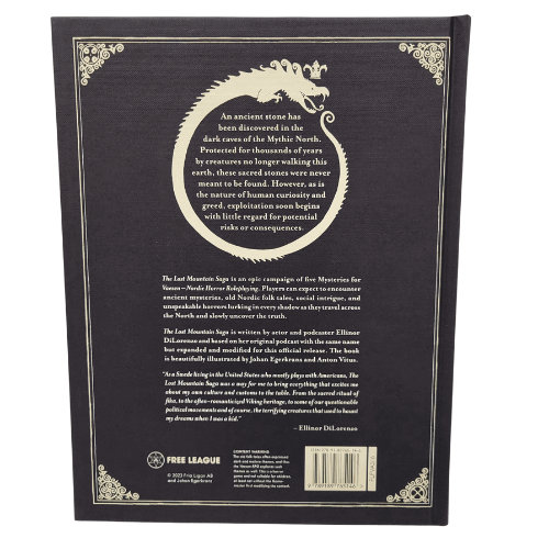 Saga Zagubionej Góry (Lost Mountain Saga) to wspaniała, nagradzana, spójna kampania wydana na pięknych kredowych stronach (w twardej okładce) dla niesamowitego horroru folkowego - gry Vaesen (od Free League). Opiera się ona bezpośrednio na słynnym podcastie RPG stworzonym przez aktorkę Ellinor DiLorenzo. Książka zawiera aż 5 rozbudowanych i połączonych ze sobą wielką intrygą spraw/tajemnic (Mysteries). Gracze (członkowie Towarzystwa w uprzemysłowionej, wiktoriańskiej Skandynawii) odwiedzą w nich pradawne sztolnie z mitycznymi minerałami, wezmą udział w niebezpiecznym balu maskowym uniwersytetu w Upsali, oraz będą badać straszliwą więzienną wyspę na północy! Aby ukryć statystyki nieludzkich Vaesenów z tej książki, dobrze wyposażyć się dodatkowo w jakiś klasyczny, gotycki ekran Mistrza Gry (lub korzystać z tego z zestawu podstawowego Vaesen).