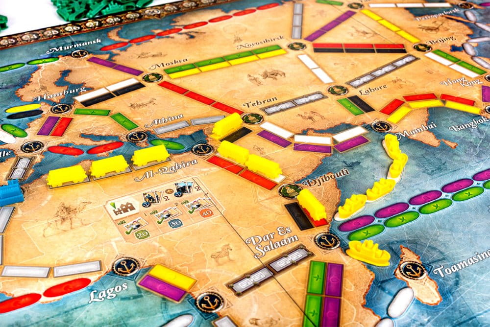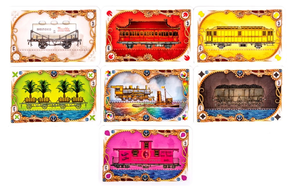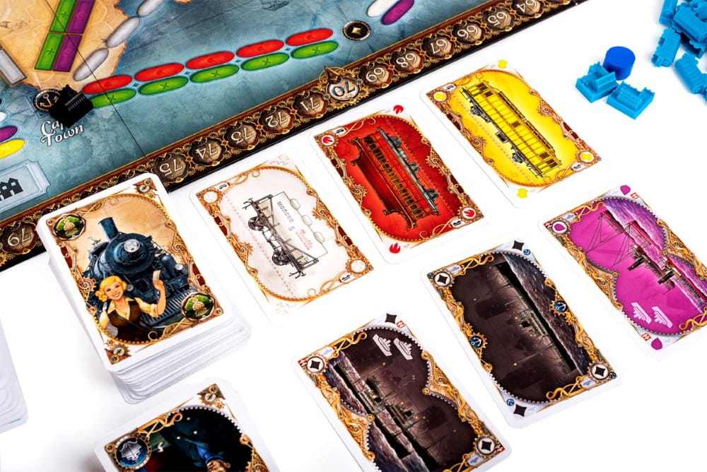 Wsiąść do Pociągu: Dookoła Świata wprowadza nowy element do znanej wszystkim mechaniki, poczynając od dwóch osobnych talii kolorowych kart - statków i pociągów. Trzy karty każdego typu są odkrywane na początku gry i, gdy gracz dobierze karty, kolejne są odsłaniane z talii, którą ten gracz wybierze.
